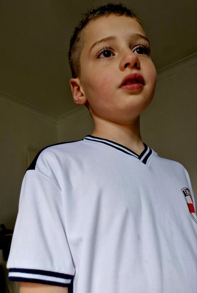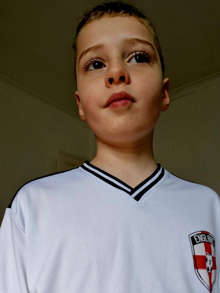 Straight after, it was into the shower to wash away all the trimmed hair. Fresh and clean, Kiefer then got dressed in his full England football strip, a favourite outfit for feeling ready for action.