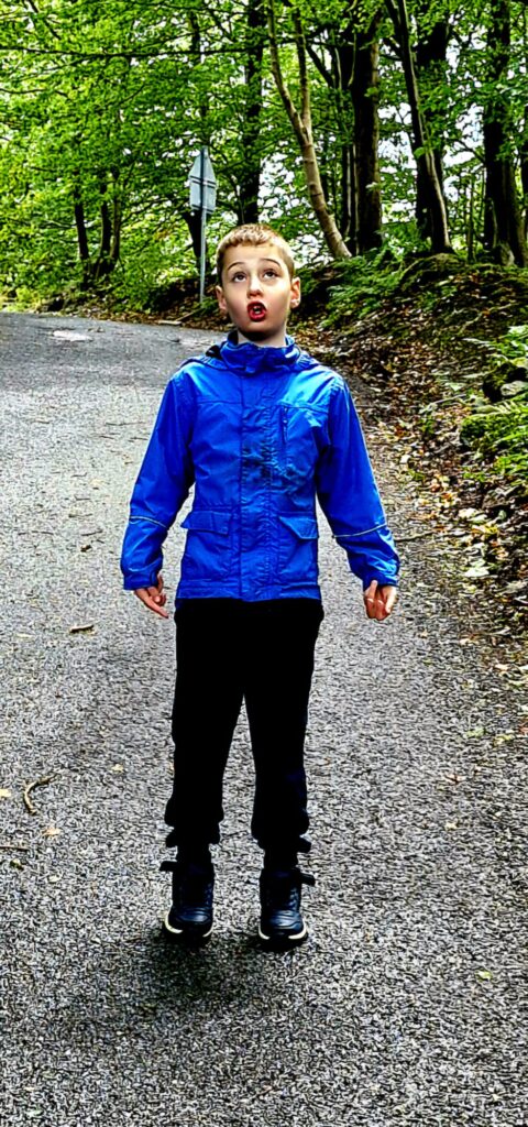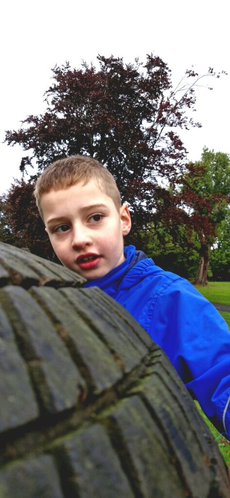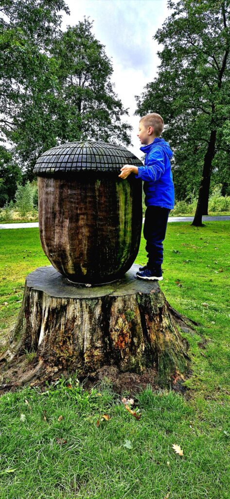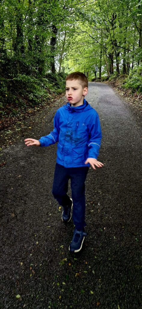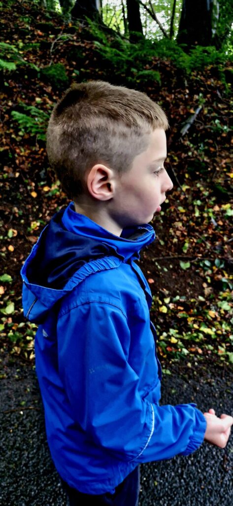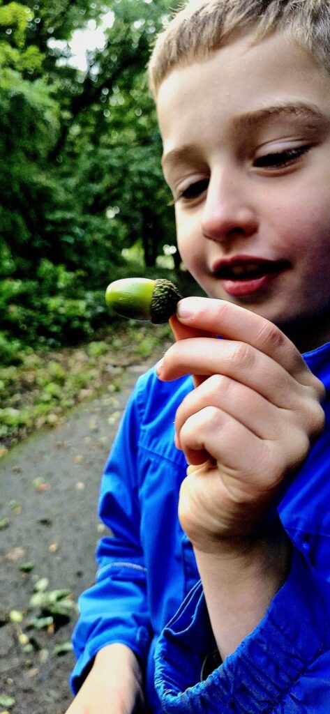 We found Kiefer was calmer after the walk and read the word acorn, writing it down on paper whilst holding the real acorn in his hand.