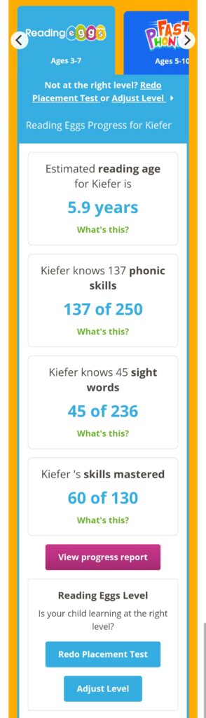 Kiefer has been able to achieve Level 61 on the Reading Eggs app: