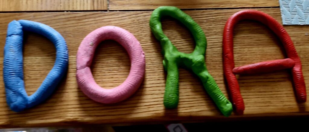 He later spoke to me about Dora and asked me to help him make the words “DORA”in clay.