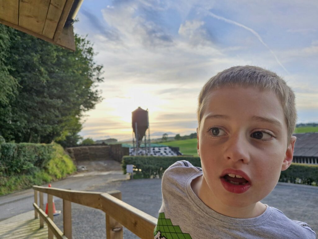 After a burst of energy bouncing and dancing this afternoon, Kiefer went out for a family picnic tea in the park and evening walk on the towpath, finishing the walk with a night-time milk, fresh from the farm.