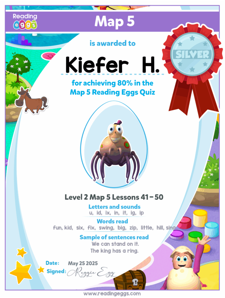 Kiefer’s latest achievement in reading eggs Map 5!
